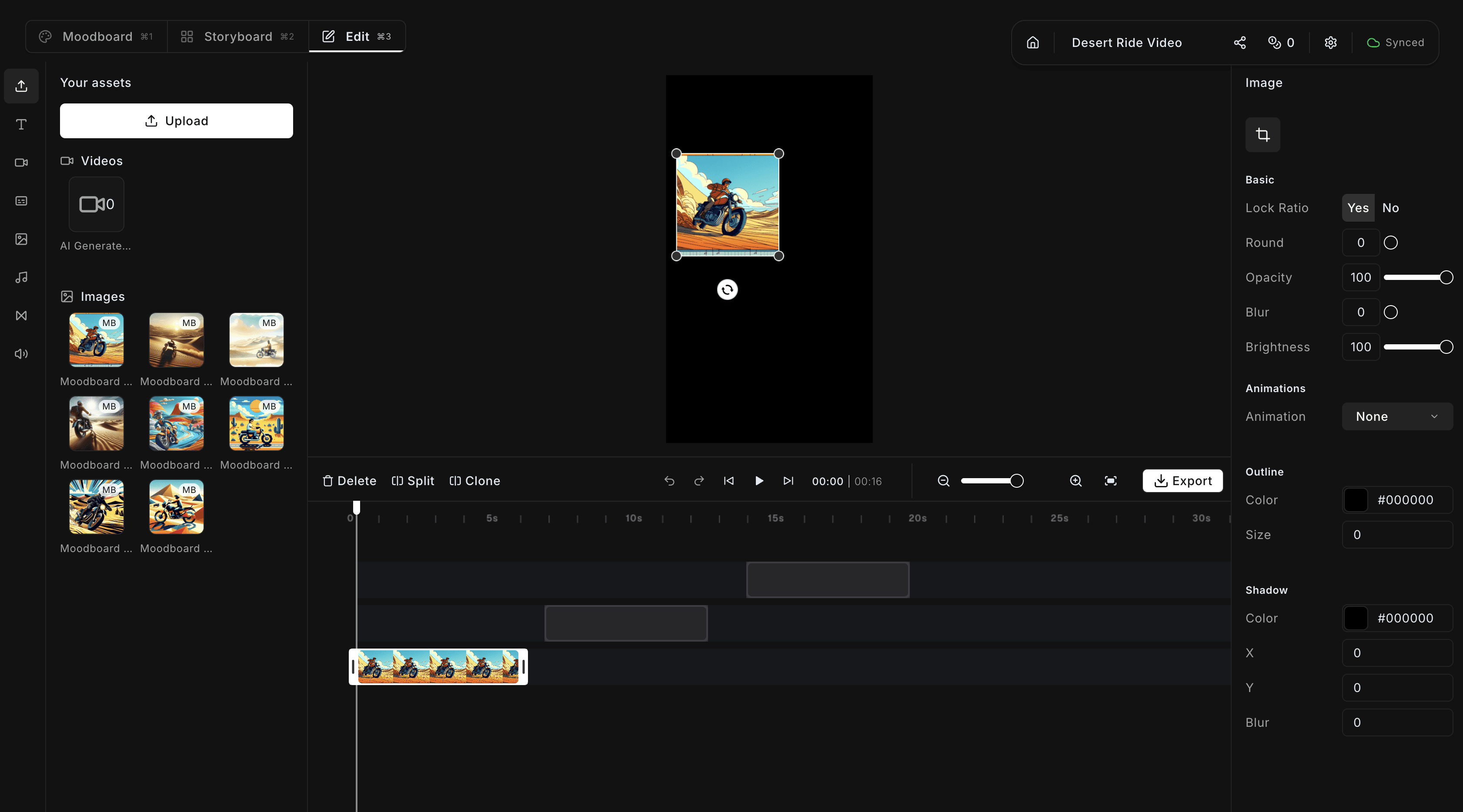 Bring shots to life with AI video generation, then polish in the editor. Add subtitles, apply presets, export.