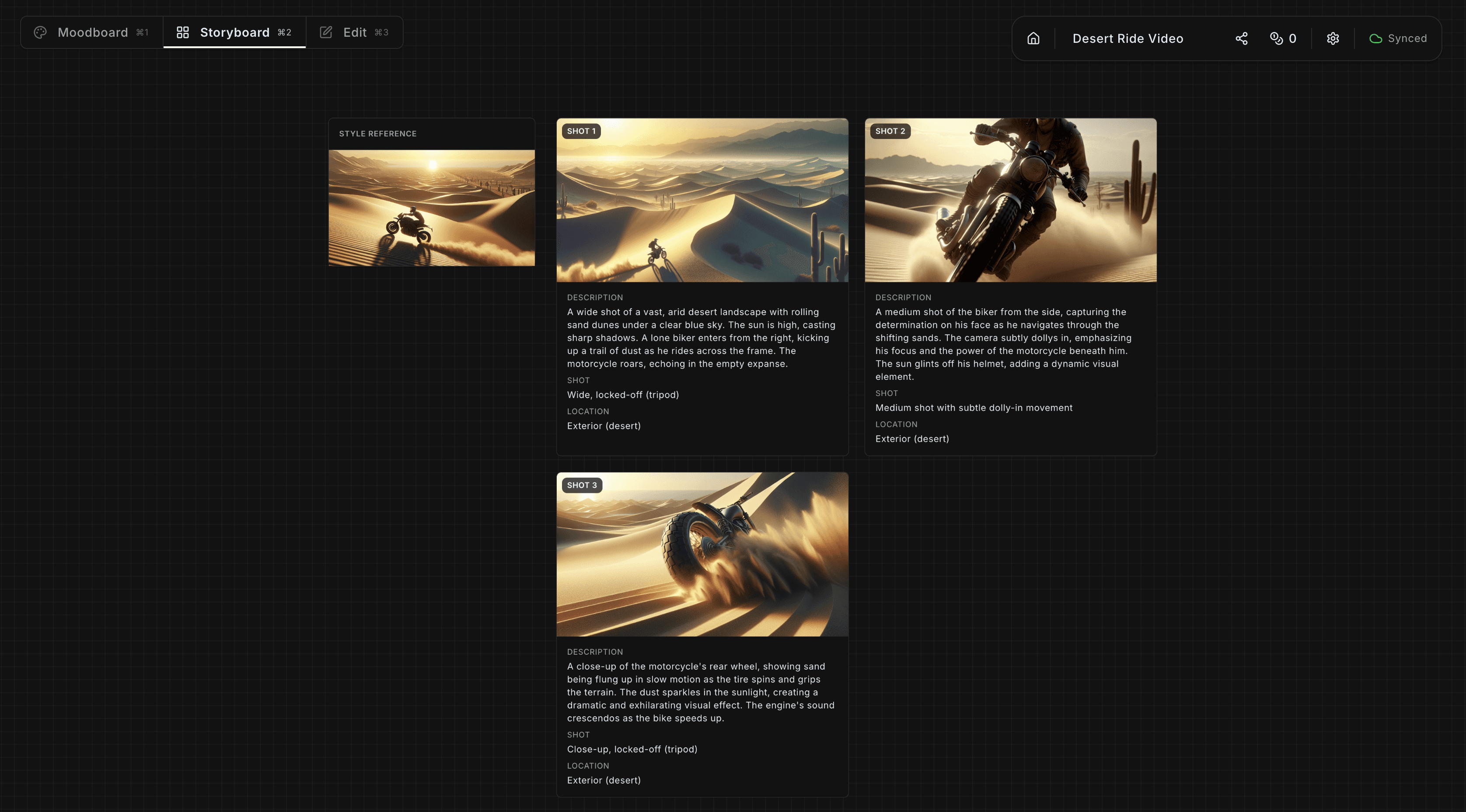 Turn your moodboard into a shot-by-shot plan. AI generates frames that match your style — no more guessing what comes next.